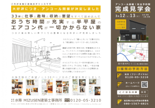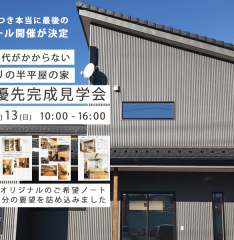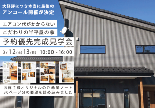 3/12・13【最後のアンコール開催】が決定!完全予約制「こだわりの半平屋の家」完成見学会 本イベントは終了いたしました先日2月9日~13日に開催した「こだわりの半平屋の家」完成見学会は、一部平日開催でしたが連日多くのお客様にご来場いただきました。ご来場いただいたお客様からは、 お施主さまの...イベント詳しくみる